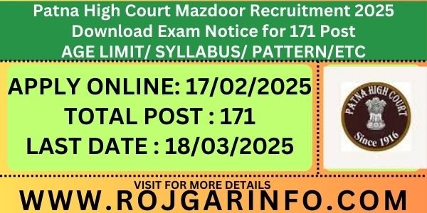 Patna High Court Mazdoor Recruitment 2025 | The Patna High Court has released a notification for the recruitment of 171 Mazdoor (Group-C) posts in 2025. This recruitment drive offers a stable career opportunity for candidates with minimal educational qualifications. Below is a detailed guide covering all aspects of the recruitment process, including important dates, eligibility criteria and exam pattern.
